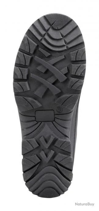 La chaussure est à bout rond et elle est équipée d’un bouclier en caoutchouc et d’une semelle antidérapante.