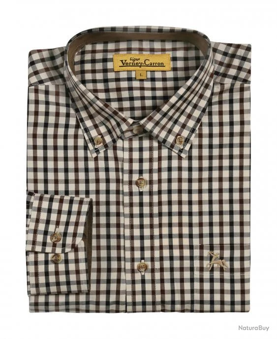 Cette chemise Ligne Verney Carron Vivien à carreaux avec son col boutonné est de couleur beige et marron.