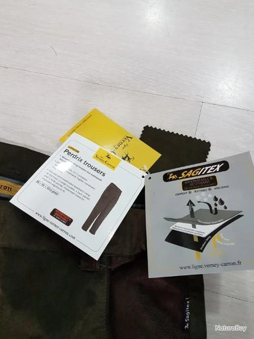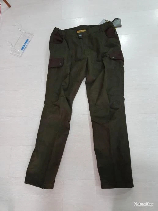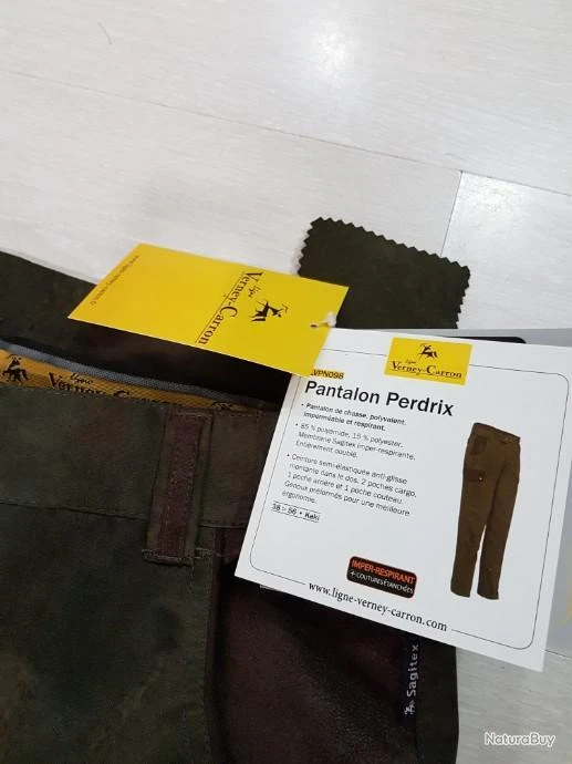 Pantalons de chasse perdrix , verney carron taille 1 de 46 , 1 de 48 ,1 de 50 et 1 de 52, 85% de polyamide 15% de polyester , ceinture semi élastique anti glisse montante dans le dos, 2 poches cargo 1 poche arrière et une poche couteau , genou préforme .