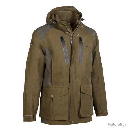 Veste silencieuse, souple, confortable, imperméable et respirante. 53% polyester, 47% coton avec empiècements extensibles 90% polyester, 10% élasthanne pour la version kaki et 100% polyester avec empiècements extensibles 90% polyester, 10% élasthanne pour la version Snake Blaze. Membrane imperméable et respirante. Coutures étanches. Doublure tricot 100% polyester pour la version kaki et légèrement ouatée pour la version Blaze. Système d’aération zippé sous les bras. Capuche tempête ajustable et détachable. Deux poches poitrine avec zip étanches, poches repose mains, 2 grandes poches basses à soufflets avec 2 rangées de cartouchières intégrées et pattes de maintien d’ouverture. A l’intérieur : 3 poches zippées, 1 poche portable, 1 poche bracelet.Poignets réglables. Carnier détachable zippé sur 3 côtés.